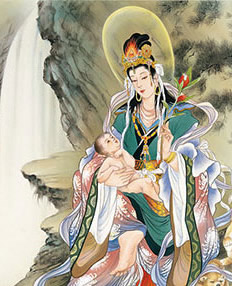 その様子を見守っておられたお釈迦様は訶梨帝母に、“千人のうちの一子を失うもかくの如し。いわんや人の一子を食らうとき、その父母の嘆(なげ)きやいかん”と戒められました。戒めを受けた訶梨帝母は、「本当に悪かった…。私が自分の子供達を可愛がるように、人間のお母さん達も、自分の子供は可愛いものなんだなぁ…。私は何という事をしたのだろう…。」と心から反省と後悔をし、はじめて人間達の苦悩の深さを悟ることができました。