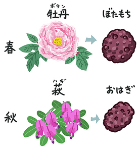 春のお彼岸の頃には「牡丹(ぼたん)」の花が咲き、秋のお彼岸の頃には「萩(はぎ)」の花が咲くことに由来しています。